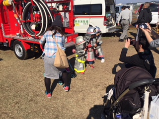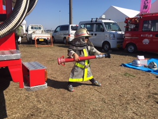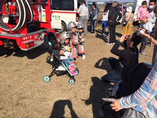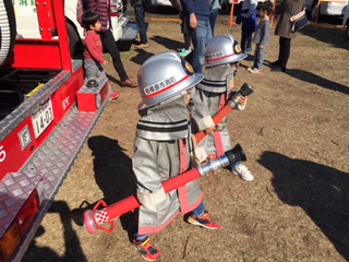 多くの子供さんが子供用防火衣を着装し、管鎗を持って頂き、消防団車両の後ろで写真を親御さんに撮影して頂きました。