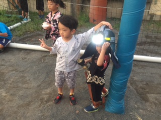 お子さんと一緒にお父さんも、防火衣、防火帽を着装し、筒先を持って写真を撮って頂いたご家族も多くおられました。