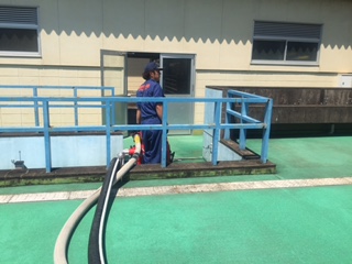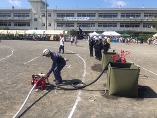 開会式前に緑が丘2丁目独立防災隊の放水実演用で使用する、防火水槽へプールの水をポンプで給水しました。