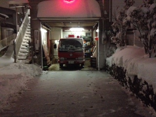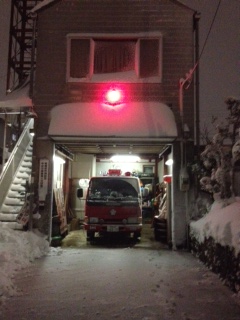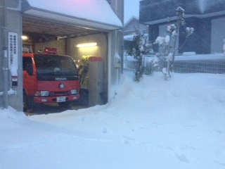 詰所の前が30cm近く、雪が積もってしまったので、消防車が出動できるよう夕方から雪かきを始めました。