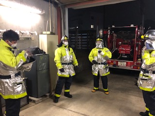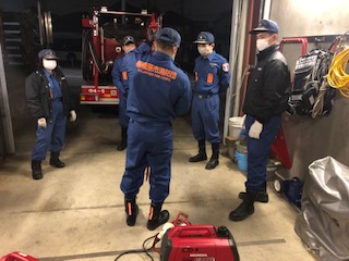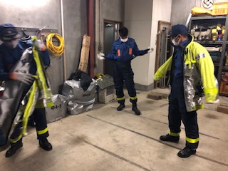 定期整備終了後、防火衣を着装する機会の少ない団員がいるため、防火衣の着装訓練をしました。