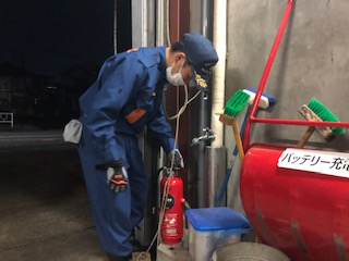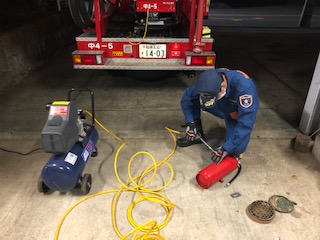 消防車に積載している水消火器の水及びエアーも充填しました。