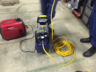 エアコンプレッサーの動力は、使用訓練も兼ねて発電機を使用しました。