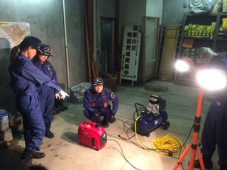 警戒チームが詰所へ帰所してから水消火器に水を入れ、エアーコンプレッサーを使ってエアーを入れました。