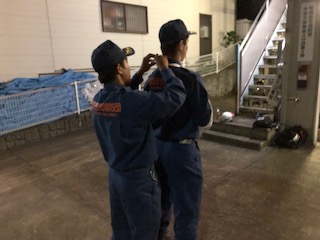 礼式訓練終了後、受持区域の警戒と新入団員向けに心肺蘇生、AED、三角巾の訓練を行うチームに分かれました。