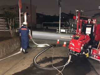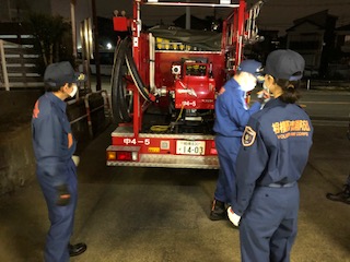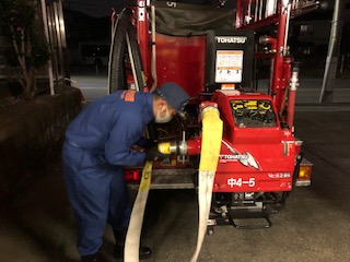 定期整備終了後、新入団員向けに詰所の防火水槽、消防車のポンプ、ホース、筒先をつないで放水訓練を実施しました。