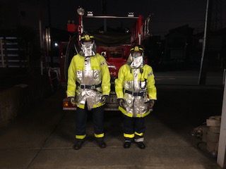 定期整備終了後、新入団員向けに防火衣、防火帽の着装訓練、及び災害発生時の詰所参集から現場移動までの訓練を実施しました。