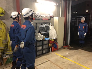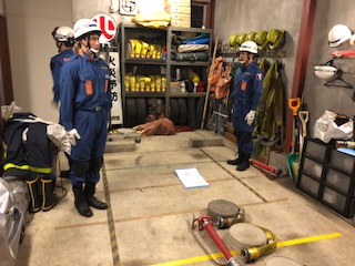 雨のため車庫内で待機、集合、点呼、開始報告、想定付与、定位までを繰り返し練習しました。