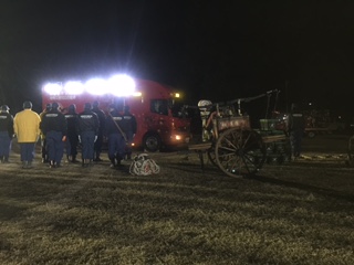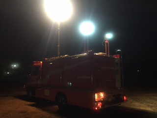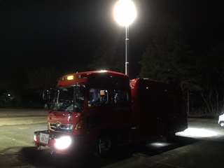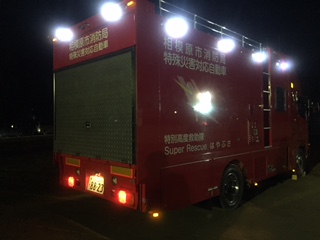 また、夜間のため、特別高度救助隊 スーパーレスキュー2台と田名特別救助隊1台の車輛の照明を訓練場に灯光して頂きました。