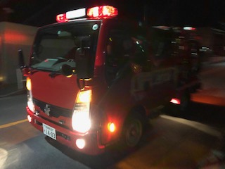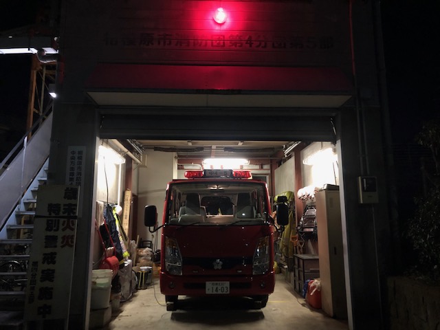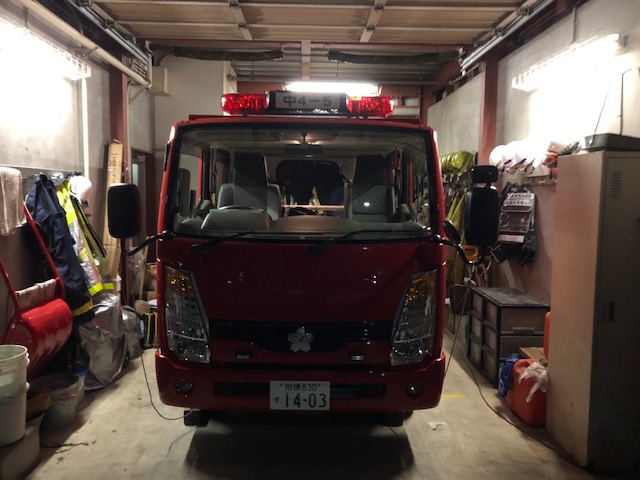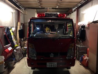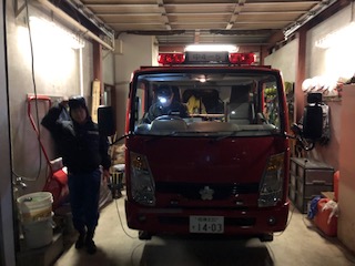 広報終了後、詰所の車庫前に消防車を出して詰所で待機しました。