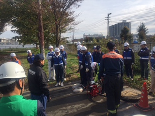 何度か放水訓練を訓練されている防災隊員の方は、初めて訓練に参加した防災隊員の方に説明されていました。
