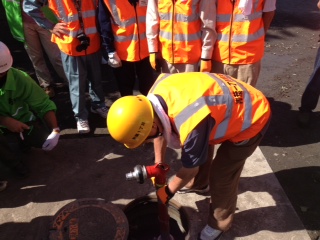 A班は、消化栓へスタンドパイプ、ホースを2本、管鎗をつないでの放水訓練。