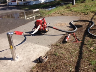 B班は、防火水槽からポンプで水を汲み上げ、ホース3本、管鎗をつないでの放水訓練を実施しました。