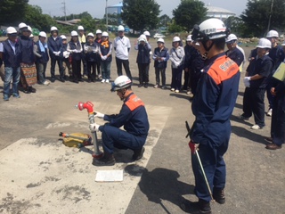 疑似消火栓、スタンドパイプ、ホース、管鎗を結合しての放水訓練