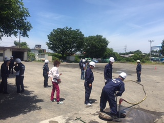 防火水槽からD級ポンプで揚水し、ホース、管鎗を結合しての放水訓練