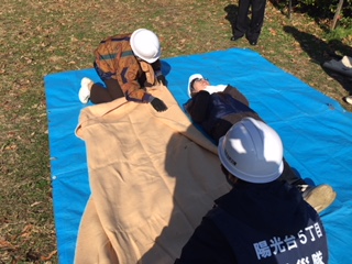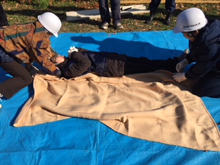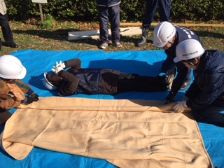 簡易担架は、複数の人が協力して行いますが、チーム力を発揮して傷病者の救出、救護を行って頂けました。