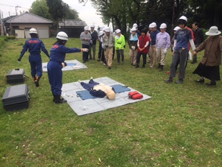 光が丘消防団は、6人参加しましたので、消火訓練(水消火器)、救急訓練(レサシアン、AED)、煙体験ハウスを各訓練、2人ずつで担当致しました。
