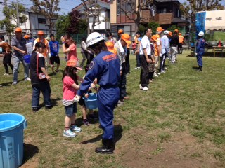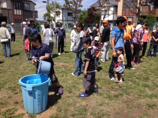 小さなお子さんも楽しみながら、バケツリレーに参加していました。